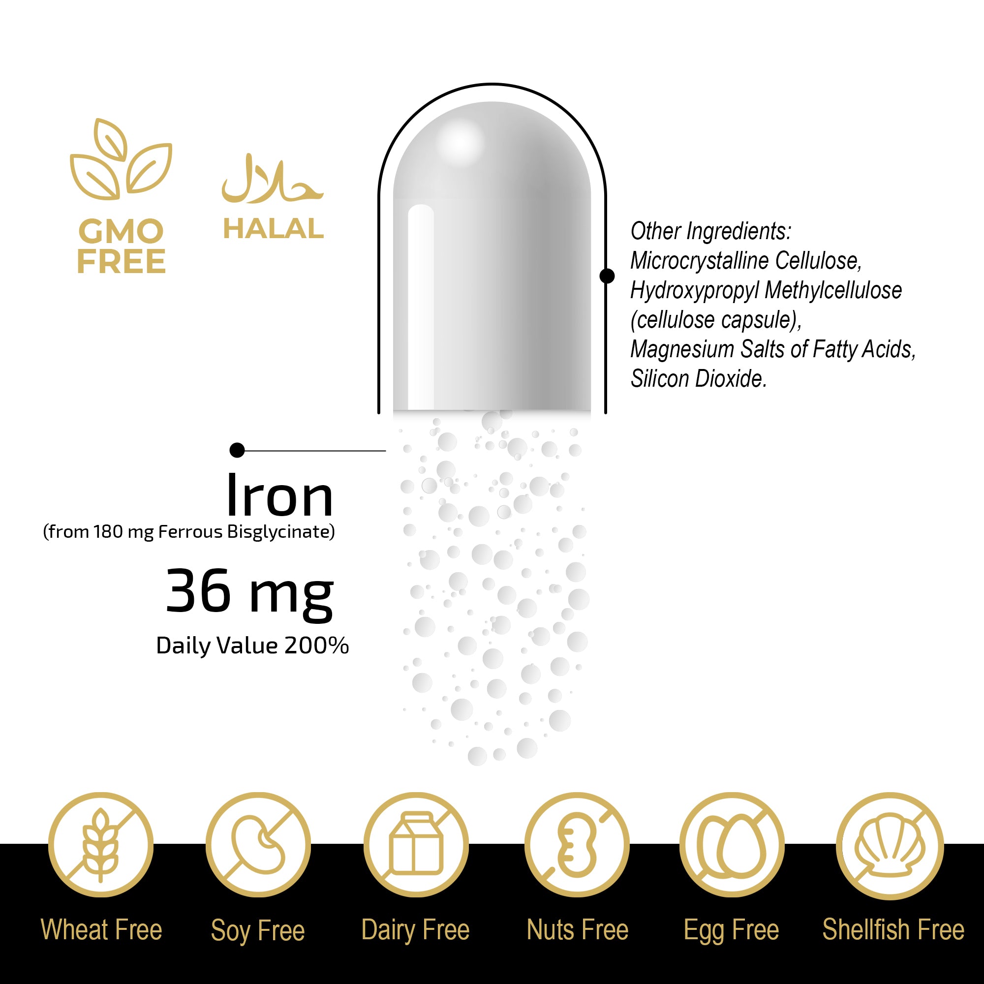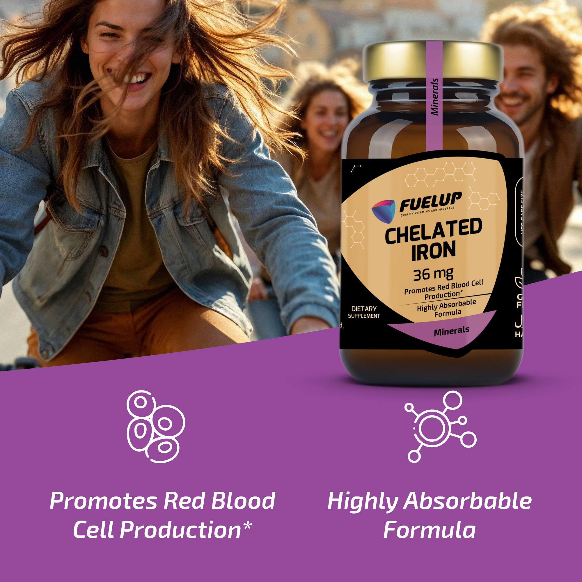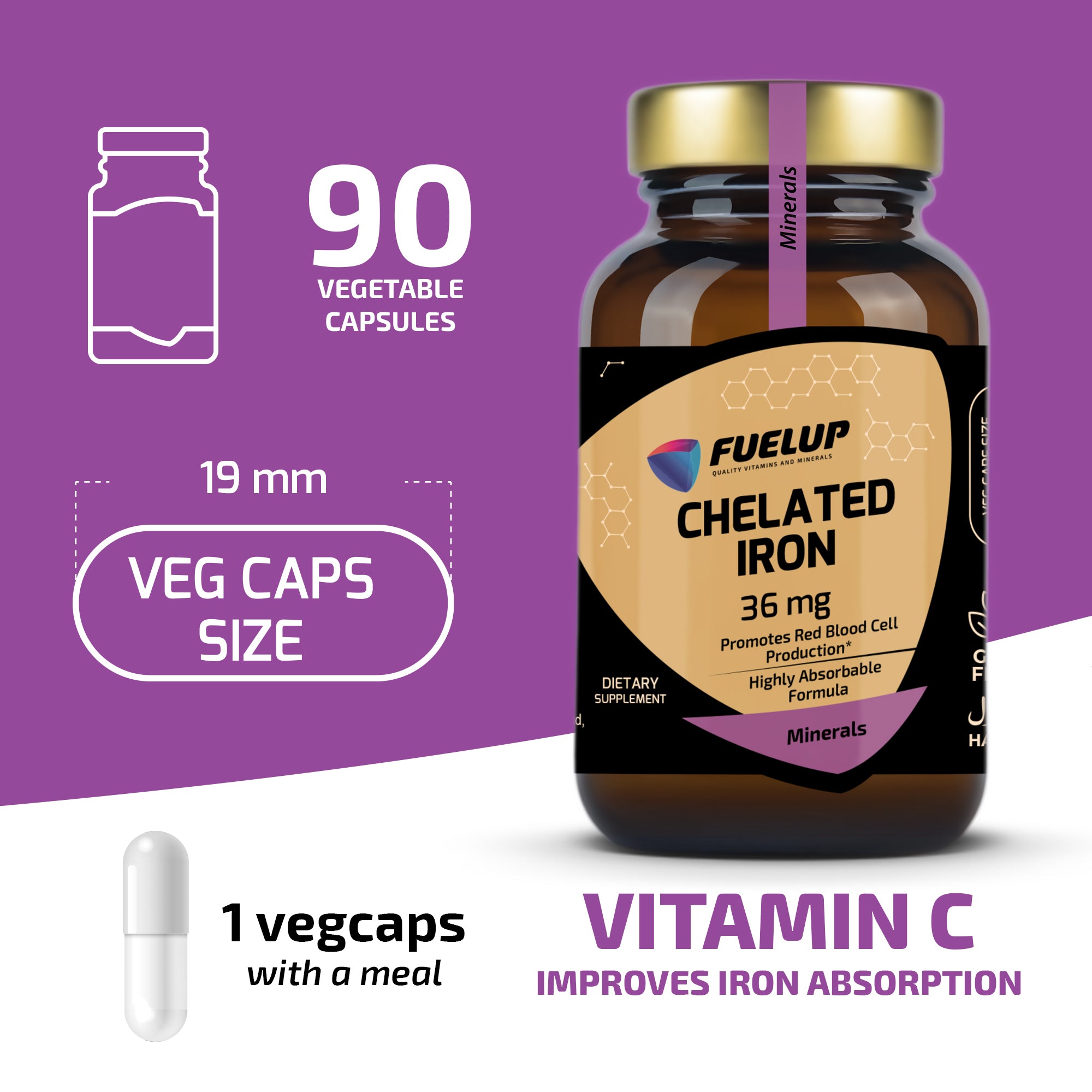 FuelUp Chelated Iron zawiera 36 mg żelaza w łagodnej i skutecznej formie (ferro-bisglicynian), znanej z wysokiej biodostępności i minimalnego ryzyka podrażnień żołądka. Wspiera produkcję czerwonych krwinek, poziom energii i układ odpornościowy – idealny do codziennego stosowania.