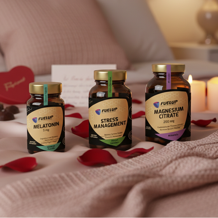 Fuel-Up Mood & Sleep to zestaw trzech synergicznie działających suplementów: melatoniny, magnezu cytrynianu i kompleksu adaptogenów na stres. Pomagają one redukować napięcie, ułatwiają zasypianie i wspierają głęboki, regenerujący sen – bez uczucia „zamulenia” następnego dnia.