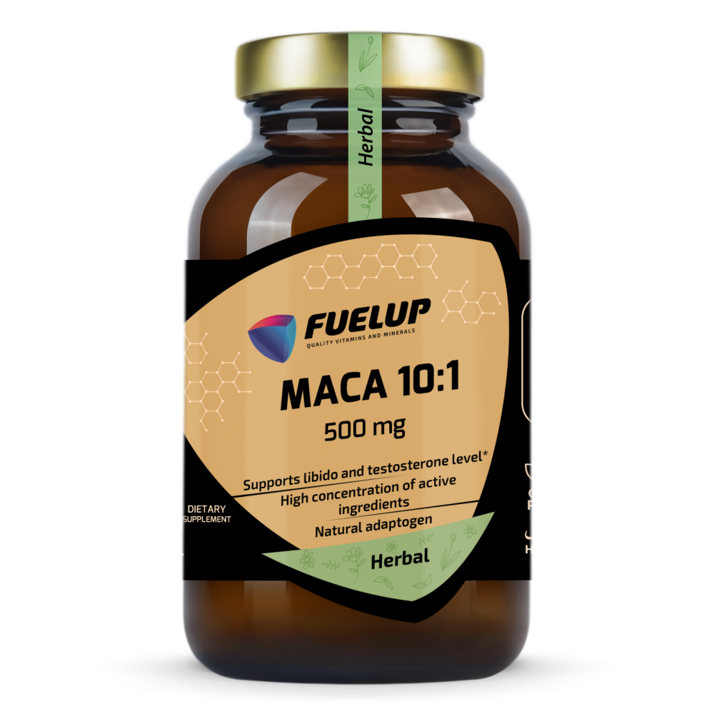 FuelUp Maca to skoncentrowany ekstrakt (10:1) z korzenia maca – naturalny adaptogen bogaty w aminokwasy, kwasy tłuszczowe, witaminy i minerały. Wspiera równowagę hormonalną, pomaga w naturalnej produkcji testosteronu, poprawia libido, wydolność i odporność na stres.